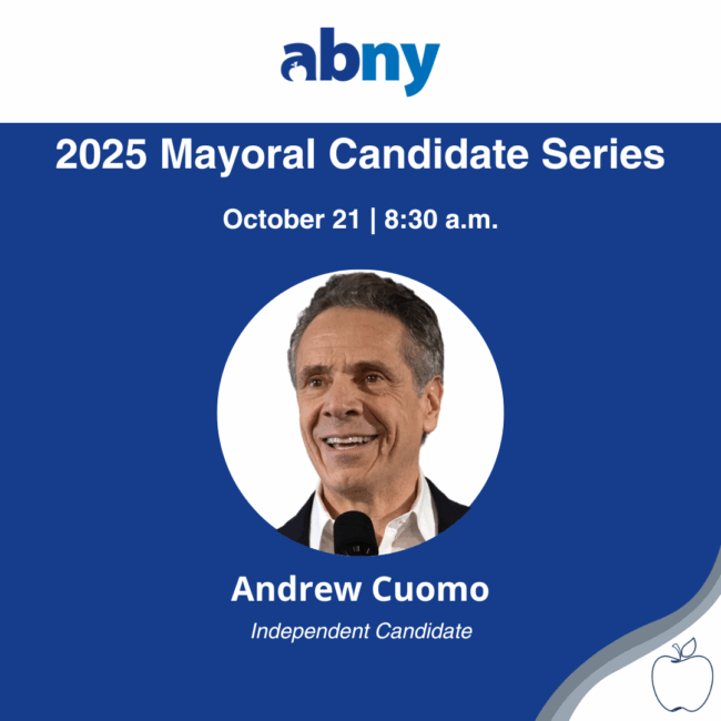 Please join ABNY's 2025 Mayoral Candidate Series with a conversation featuring Governor Andrew Cuomo. As we look ahead to the General Election this November, ABNY will host individual discussions with each of the mayoral candidates, providing a platform to share their vision for the future of New York City and an opportunity for the ABNY network [...]